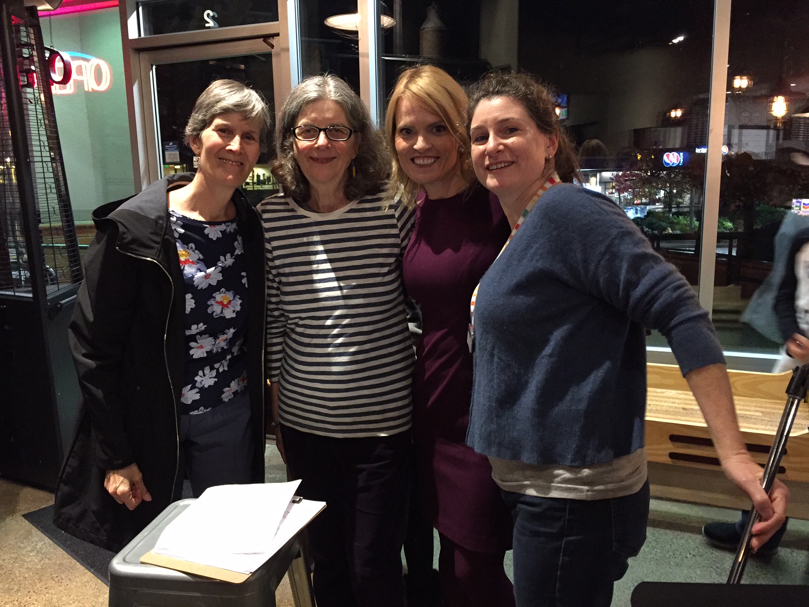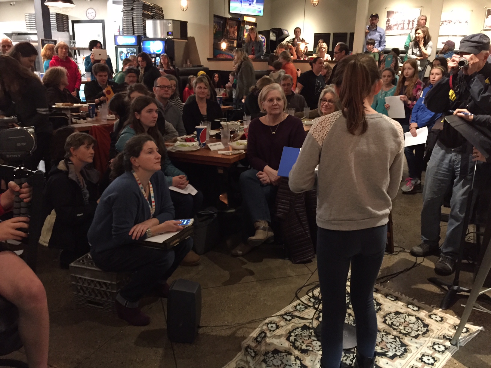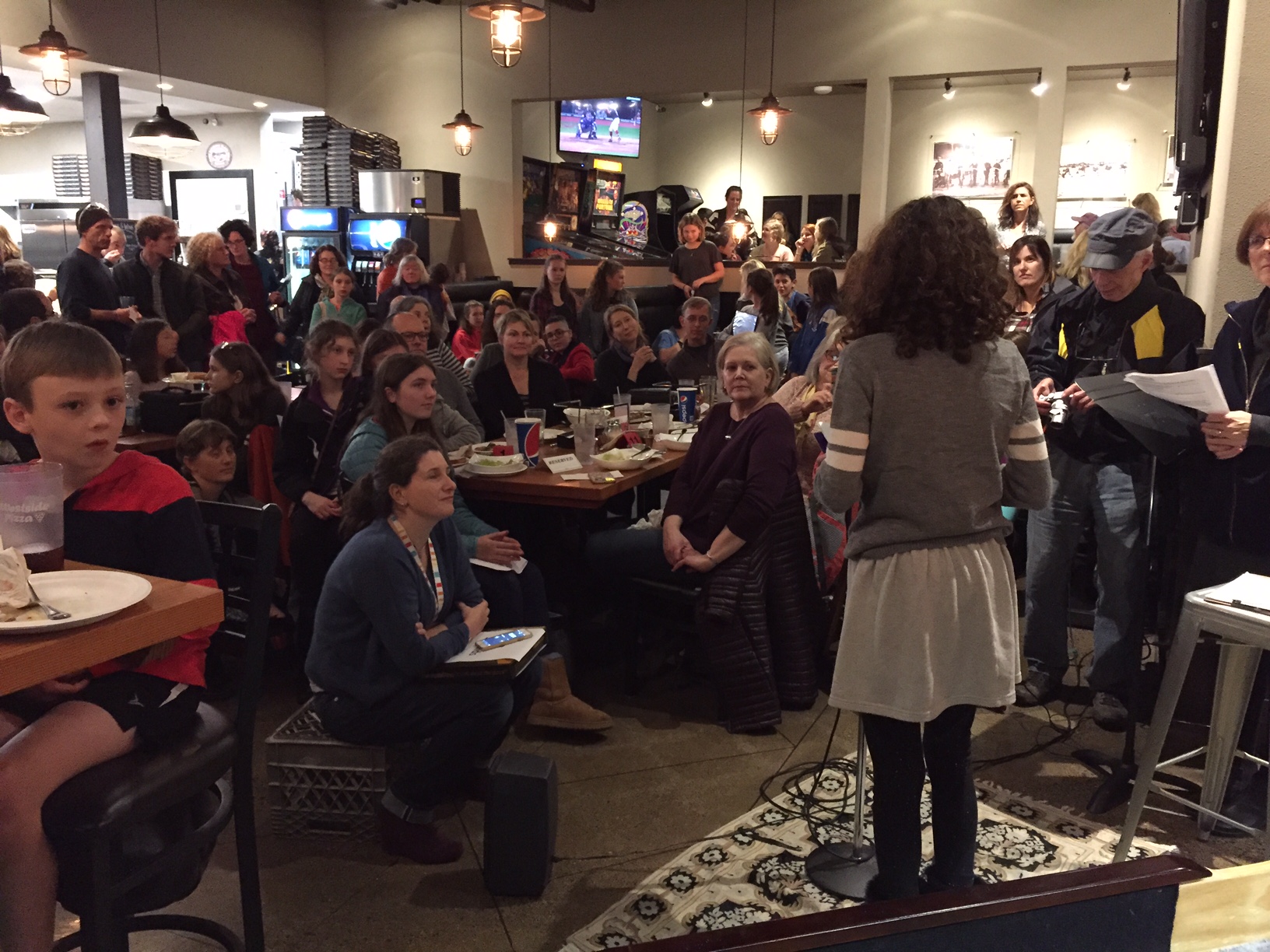 The Teen Story Slam was a long time coming. We didn’t pursue the idea actively at first because, well, we writers tend to prefer working quietly by ourselves, sharing our work with only a select few. But it didn’t hurt to ask the students at our Teen Writers Workshop what they felt about the idea. Margaret and I were pleasantly surprised to hear several were game. A small Teen Story Slam organizing team took formation, consisting of Margaret and me, Jenny Bloom (teen librarian), and Jennifer Hager (editor and BARN Writers Steering Committee). With the support of Bainbridge Public Library, the Bainbridge Artisan Resource Network (BARN), and Kitsap-area middle and high school creative writing teachers, we hosted our very first Teen Story Slam at Westside Pizza. We’d expected an intimate circle in a small corner of the venue. What we ended up with was a miracle.